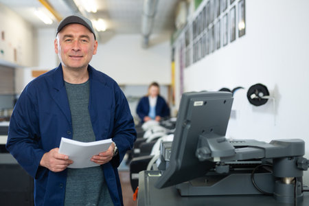 Printing house interior with modern offset print machine and operator in working uniform checking quality and controlling process of print.