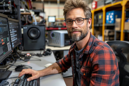A smiling senior Swedish male electronic factory worker standing in factory. Generative AI AIG19.