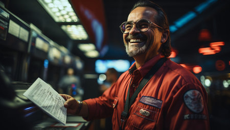 A man wearing a blue uniform is captured with a joyful expression, pointing directly at the camera. The image showcases a medium shot with focus on the person, emphasizing a gesture. The lighting appears soft and balanced within an indoor setting, with potential applications in various commercial contexts.