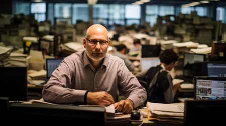 Journalistic photographer with press pass captures newsroom atmosphere with camera