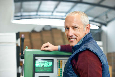 This panel is the nerve center of the factory. Portrait of a mature man standing next to machinery in a factory.