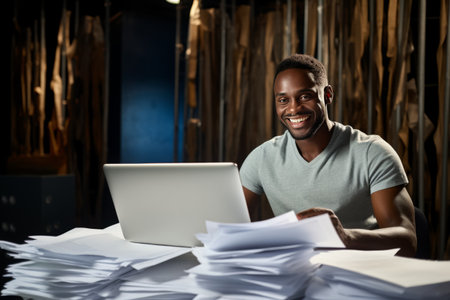 Successful African American Man Embracing Professional Accomplishments with Laptop and Paper Sheets: