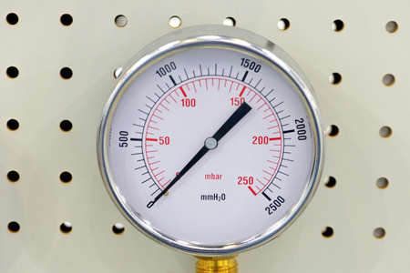 High pressure gauge in the oil system of industrial equipment, pumps and pipelines with a red line. Technical indications