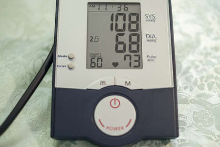 nurse holds mechanical tonometer in hands, arrow shows high pressure, closeup of tonometer display