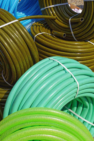 New Rubber watering hoses. Pile of new colorful coils of polymer hoses for watering, garden tools in stock on display case for sale. Stack of pvc pneumatic flexible reinforced hoses in a shop