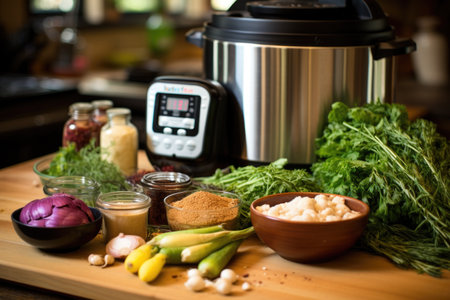 A sleek electric pressure cooker takes center stage on a wooden countertop, surrounded by vibrant kitchen herbs and stylish d