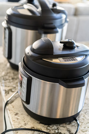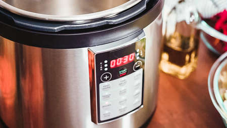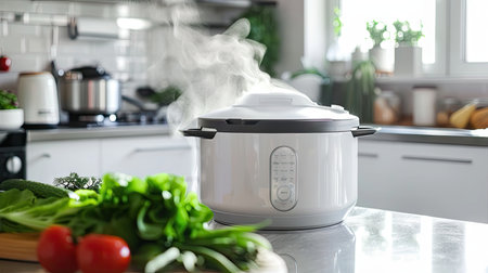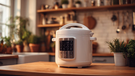 Close up view of a versatile multi cooker appliance on a stylish kitchen countertop