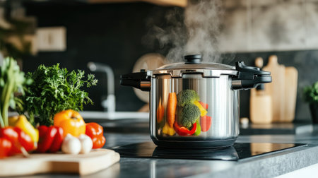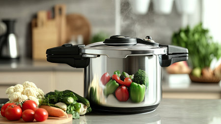 A sleek stainless steel pressure cooker sits on a kitchen countertop, surrounded by an array of fresh vegetables, embodying comfort and healthy cooking.
