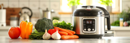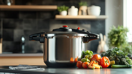 A modern pressure cooker sits on a stylish kitchen counter surrounded by fresh, colorful vegetables, showcasing a healthy cooking environment.