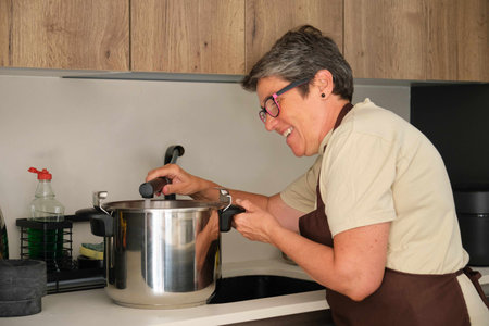 Mature Spanish woman adding water to the stew, cocido madrileño, in a pressure cooker.