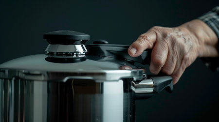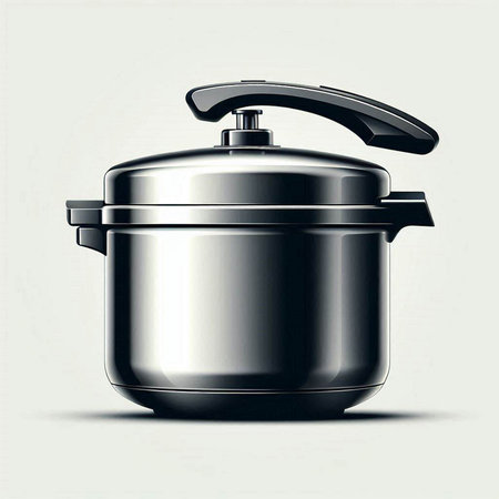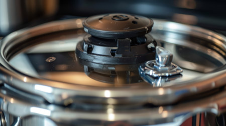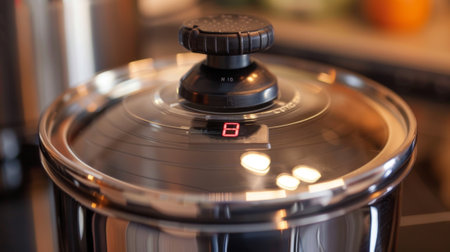 A close-up of a pressure cooker on a stovetop, with steam escaping from the top, highlighting its functionality and sleek design.