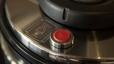 A closeup of the safety release valve on an electric pressure cooker with its red button and engraved instructions for releasing pressure