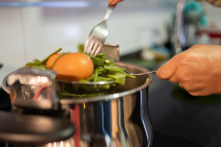 woman hands taking boiled eggs and green beens out of cooking pot with a fork and spoon