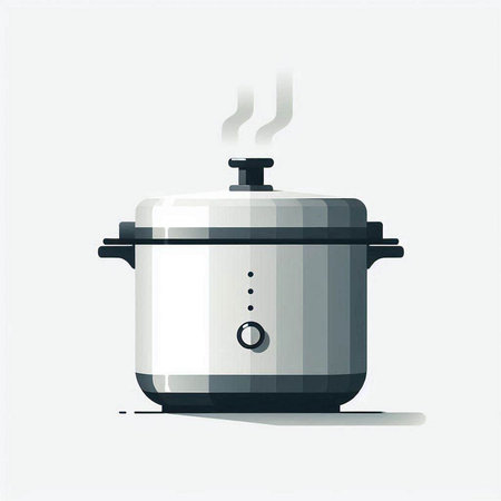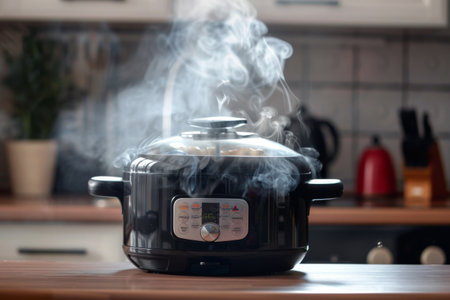 A slow cooker emits steam as it prepares a delicious meal in a warmly lit kitchen. The comforting aroma fills the space, promising a flavorful dining experience ahead.