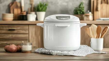 A sleek white rice cooker sits on a rustic wooden kitchen table. Surrounded by cooking utensils and fresh ingredients, it embodies a modern cooking scene.