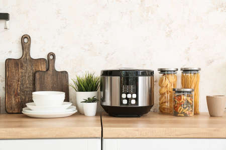 Modern electric multi cooker on table in kitchen. Cooking at home concept