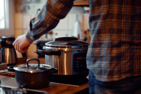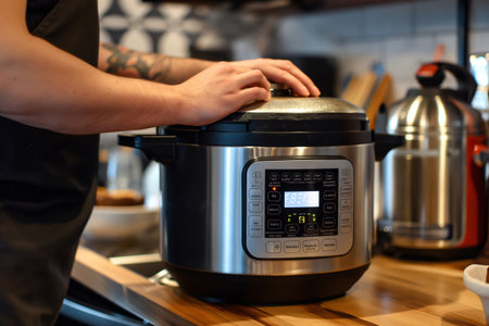 Man skillfully cooks with a modern multi cooker in a sleek kitchen, creating a gourmet meal effortlessly
