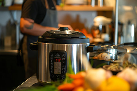 Stainless steel electric multicooker is sitting on a kitchen counter with fresh ingredients and a chef preparing a meal in the background
