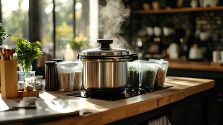 A modern kitchen showcases a stylish pot releasing steam, surrounded by fresh herbs and ingredients. Bright natural light highlights a cozy cooking ambiance.