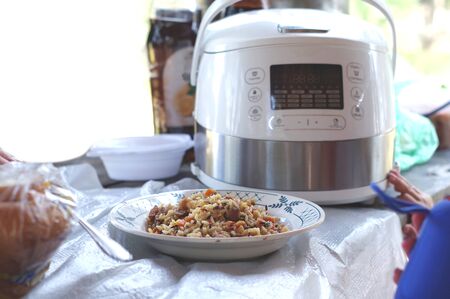 Cooking pilaf in a slow cooker. Slow cooker in nature. Homemade pilaf in nature in a slow cooker.