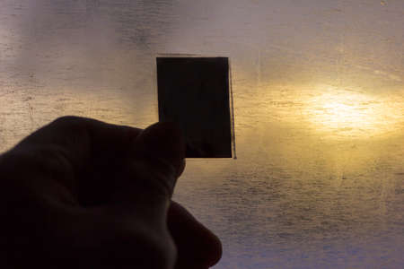Beautiful female fingers hold a glass negative. On the negative is depicted the area of Michali. Suzdal.