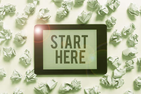 Writing displaying text Start Here. Concept meaning telling someone this is beginning point to go from to destination Businessman in suit holding tablet symbolizing successful teamwork.