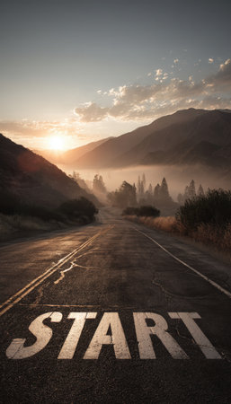 A scenic mountain valley road at dawn, featuring a START marking illuminated by the rising sun. The cinematic realism evokes motivation and new beginnings.