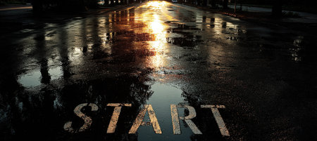 A cinematic image of a START marking on wet asphalt, capturing reflections of trees and sunlight after rain. The scene symbolizes a fresh beginning and new opportunities.