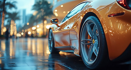 Luxury sports car in urban setting Automotive and success concept Sleek, high-performance sports car parked on city street at night, reflections of neon