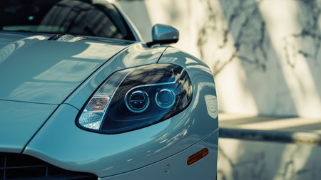 Silver sports car headlight and body detail with a textured wall background and sunlit reflections.
