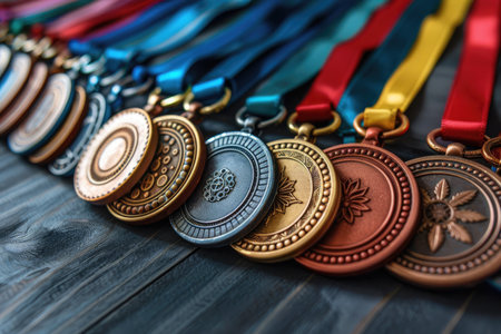 A captivating arrangement of elegant medals in gold, bronze, and silver, showcasing intricate designs. Perfect for themes of achievement and recognition.