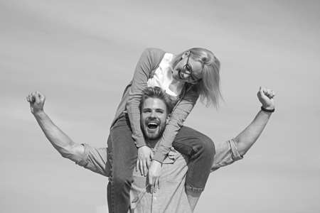 Couple happy date having fun together. Lovers enjoy date and feeling free. Freedom concept. Couple in love enjoy feeling freedom outdoor sunny day. Man carries girlfriend on shoulders, sky background