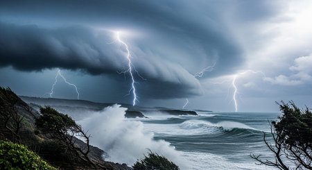 With showing coastal storm with crashing waves, lightning strikes, and lush greenery on shore. resolution use.