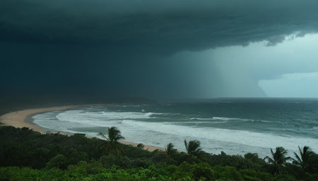 A powerful storm rolls across a green landscape with palm trees under a dark, ominous sky. The image captures a dramatic, nature-driven moment ideal for weather and travel content.