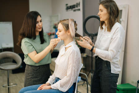 Professional make-up artist making face makeup while hairdresser making hair-do for young woman in beauty salon. Concept of backstage work.