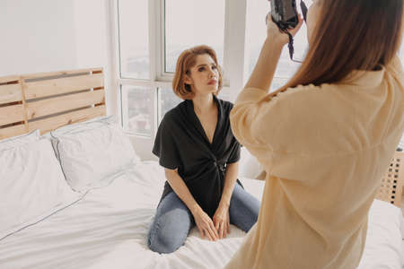 Asian woman photographer is taking a photo of her woman fashion model.