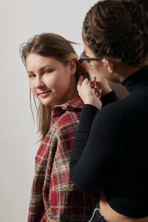 Stylist make image of contemporary model in photographic studio. Two young women. Photo equipment