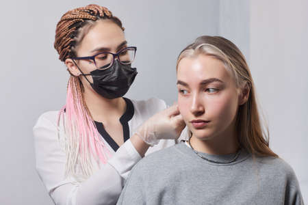 A young woman undergoes an eyebrow correction procedure in a beauty salon, close-up. the girl paints her eyebrows in the salon.
