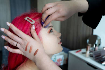 Female models are coloring their faces with professional makeup.