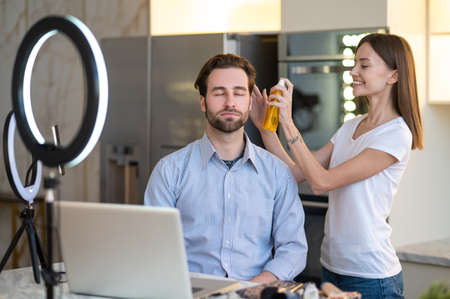 Long-haired woman making hair to a man before webinar