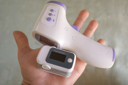 An adult male holds a pulse oximeter on his index finger. Pulseoximeter is a medical monitoring and diagnostic device for measuring oxygen saturation in capillary blood. selective focus