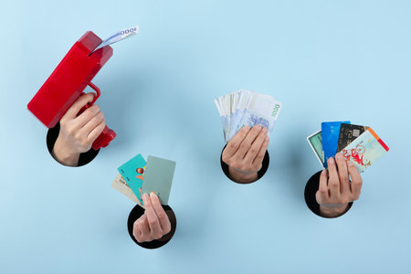 Hand giving dollar currency and hand take, over blue background. Giving money to help