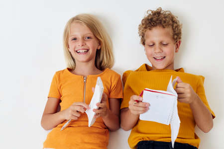 Cute stylish kids drawing fun games with notepad childhood lifestyle unaltered