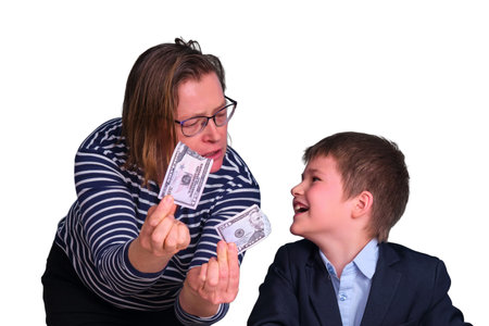Naughty child and spending money in dollars on children education, isolated on a white background