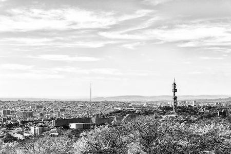 PRETORIA, SOUTH AFRICA, JULY 31, 2018: A neastern view of Pretoria as seen from the historic Fort Schanskop. The University of South Africa, a microwave telecommunications tower and the Loftus Versveld stadium are visible. Monochrome