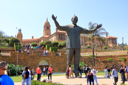 September 29 2022 - Pretoria in South Africa: People around the Nelson Mandela statue on his square in front of Union Buildings in Pretoria, South Africa