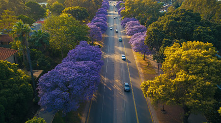 aerial view of a street lined with blooming jacaranda trees, created with generative ai