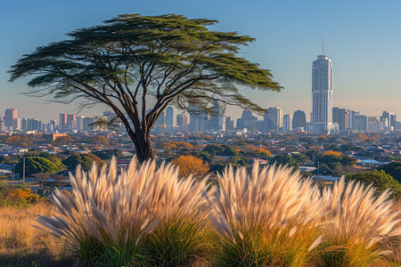 Johannesburg cityscape at sunset, showcasing a panoramic view of the urban skyline with high-rise buildings, the iconic Hillbrow Tower, and a foreground of grassy hills, highlighting the contrast between nature and urban development.