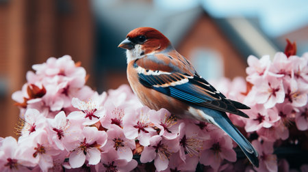 Floral background with little sparrow bird perching on branch of blossom cherry tree with flowers