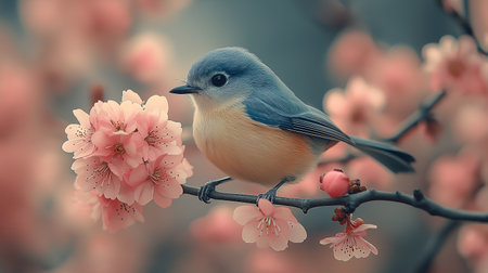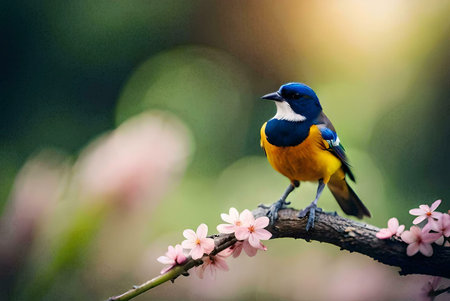 A blue and yellow bird is perched on a branch of a pink flower. Concept of tranquility and beauty, as the bird is surrounded by the delicate pink blossoms. The scene evokes a feeling of peace